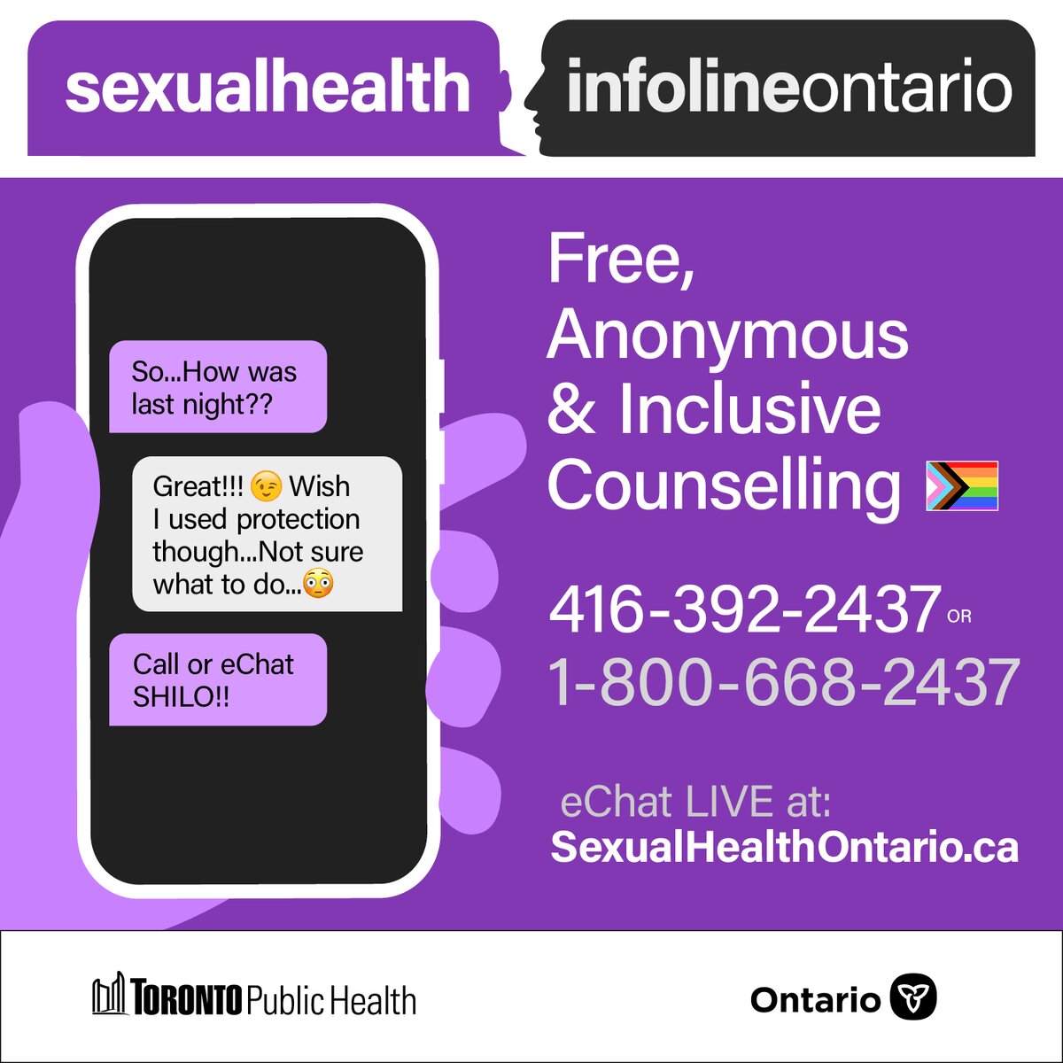 Call to speak to a live counselor from anywhere in Ontario. Services are also offered in various languages including French. For more information please go to https://www.toronto.ca/community-people/health-wellness-care/sexual-health-infoline-ontario/